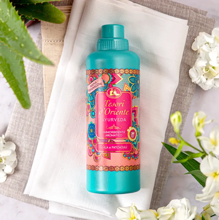 La sua formula cremosa, senza coloranti, ammorbidisce i tessuti, li rilassa e ne facilita la stiratura, per capi soffici e profumati come una vera coccola ayurvedica.