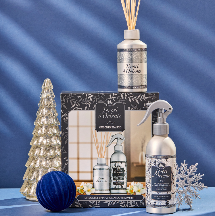 Per chi ama profumare la casa, la linea natalizia include set dedicati al benessere dell’ambiente, con Diffusore con bastoncini e Deo Spray Ambiente Aromatico.