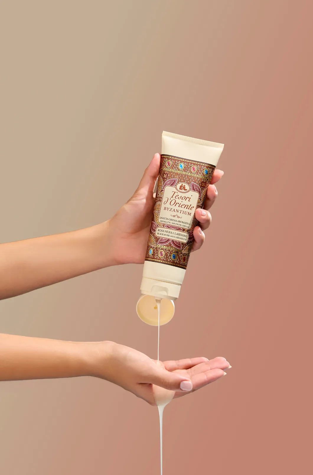 Un viaggio immaginario nella leggendaria città di Bisanzio, racchiuso in una morbida crema aromatica che avvolge delicatamente corpo e sensi.