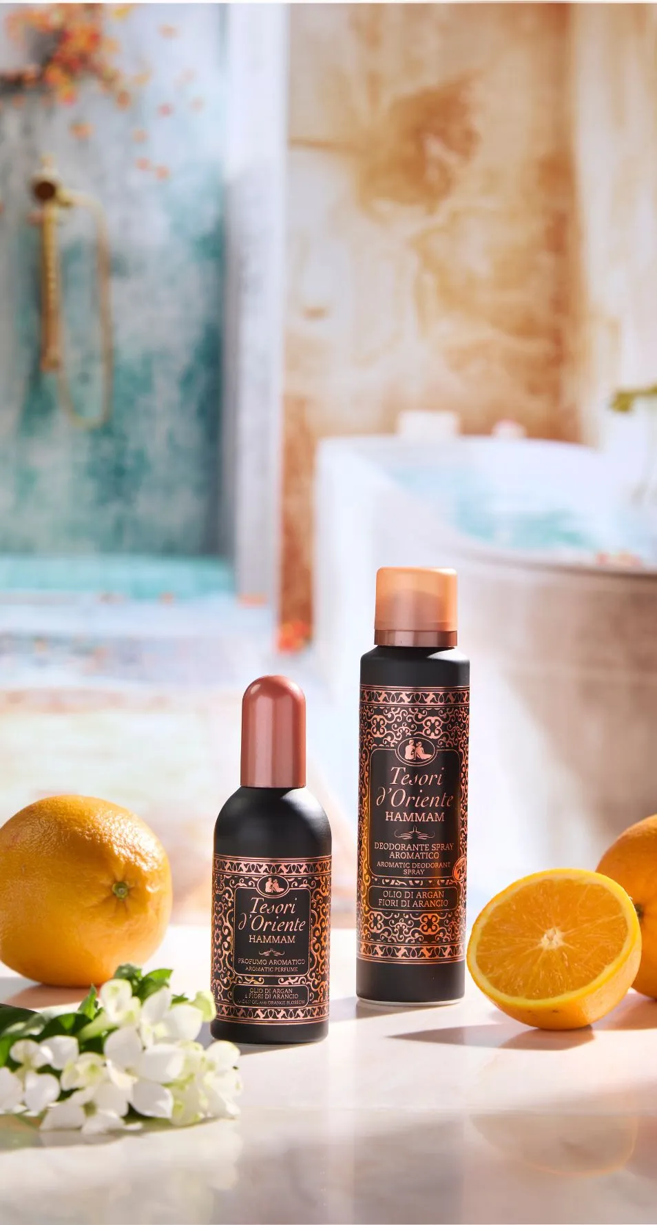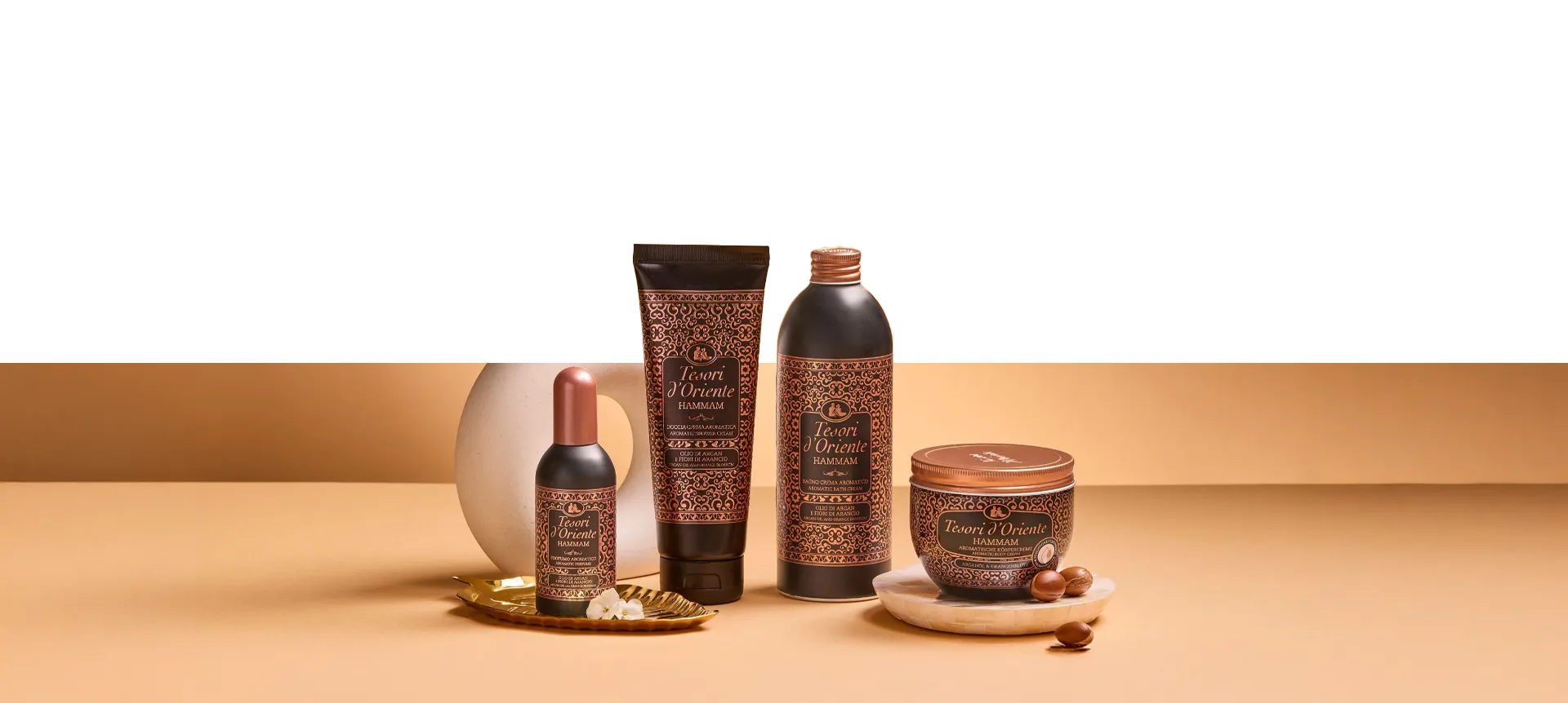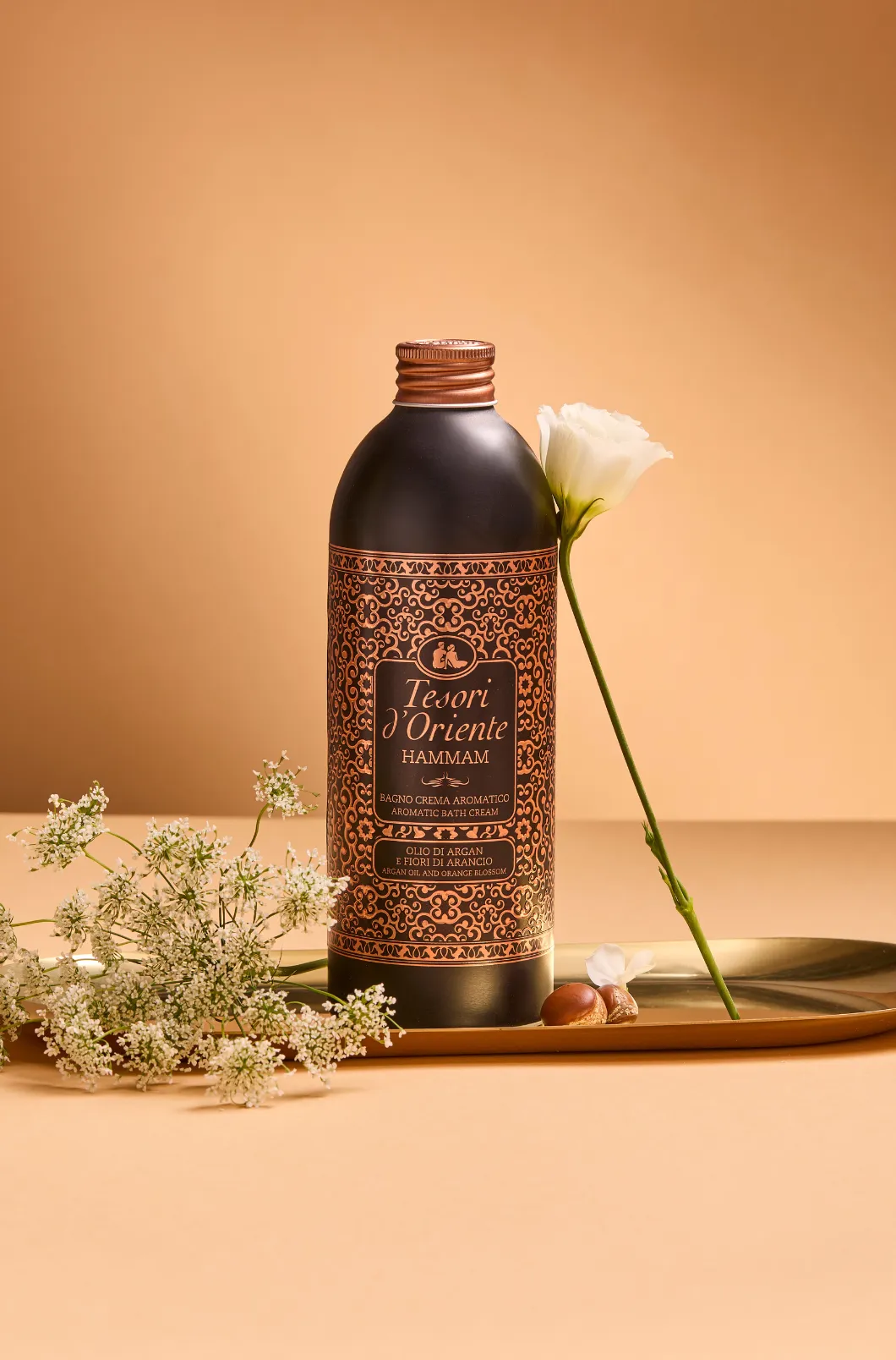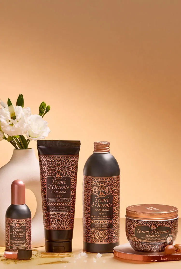 Ispirata ad uno dei più antichi rituali di pulizia, la linea Hammam è stata pensata per regalarti l’esperienza unica di un vero trattamento di bellezza e benessere a casa tua. Ricca di olio di Argan, noto da sempre per le sue proprietà antiossidanti, emollienti e idratanti, questa linea unisce l’eleganza dell’estratto di Fiori d’Arancio al raffinato profumo di Gelsomino Sambac e agli oli essenziali di Clementina. Il risultato è una fragranza inconfondibile che avvolge i sensi e trasforma ogni gesto quotidiano in un momento di puro piacere.