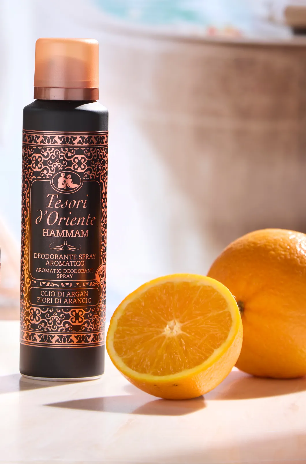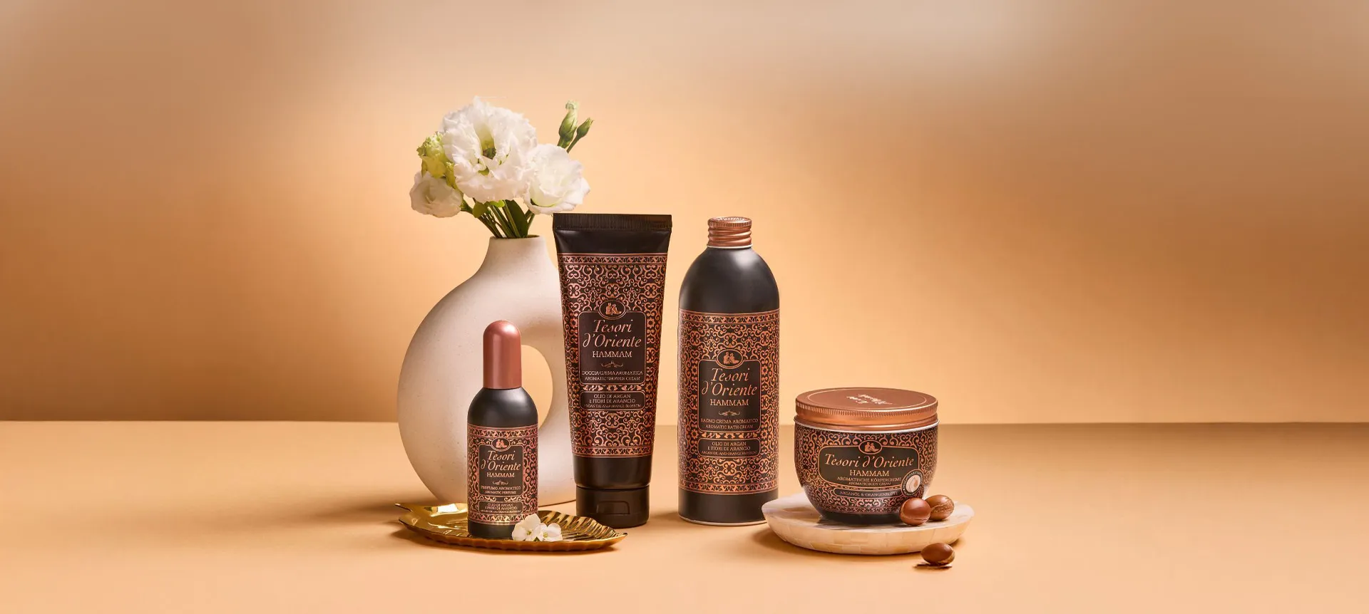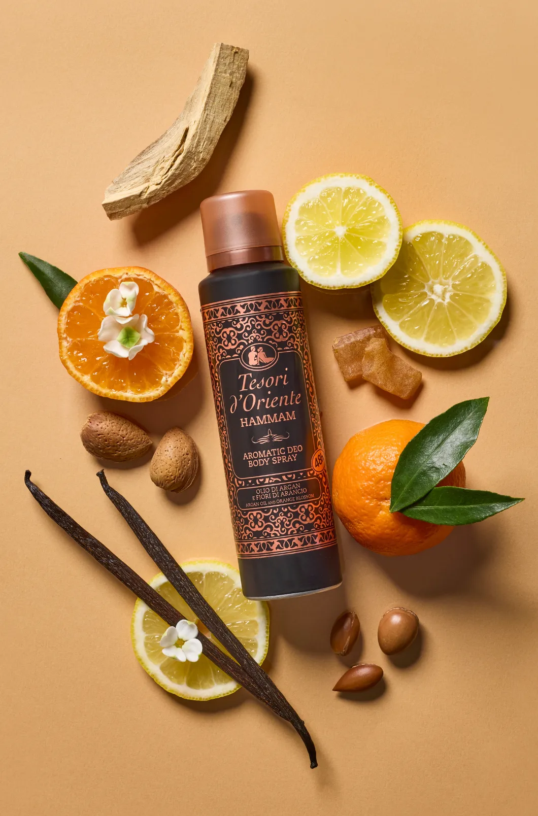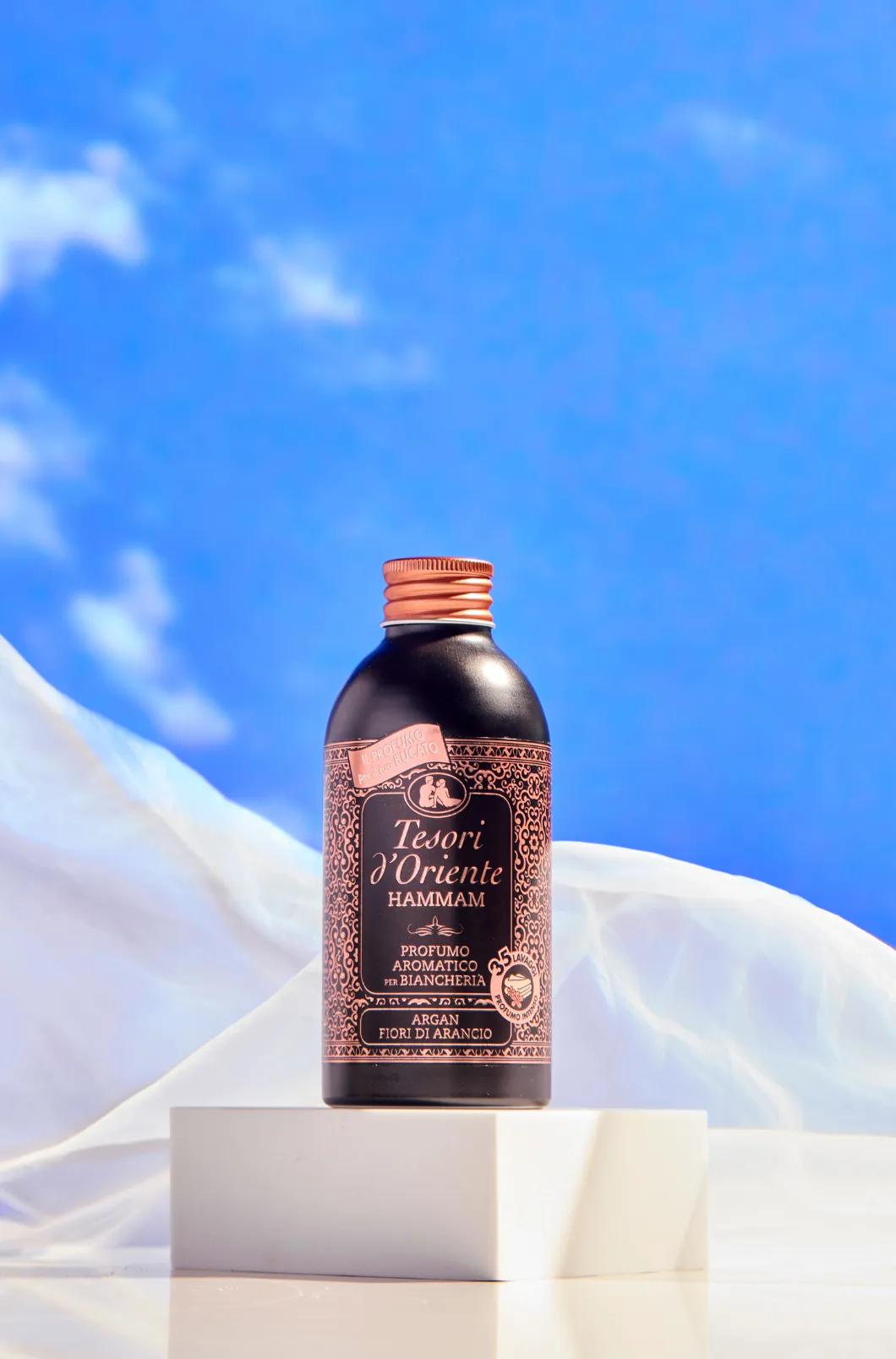 Ispirata ad uno dei più antichi rituali di pulizia, la linea Hammam è stata pensata per regalarti l’esperienza unica di un vero trattamento di bellezza e benessere a casa tua. Ricca di olio di Argan, noto da sempre per le sue proprietà antiossidanti, emollienti e idratanti, questa linea unisce l’eleganza dell’estratto di Fiori d’Arancio al raffinato profumo di Gelsomino Sambac e agli oli essenziali di Clementina. Il risultato è una fragranza inconfondibile che avvolge i sensi e trasforma ogni gesto quotidiano in un momento di puro piacere.